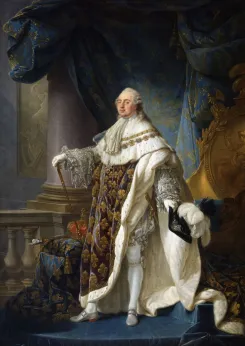 Dans ce portrait officiel, Louis XVI est représenté de la même manière que Louis XIV dans son célèbre portrait de Hyacinthe Rigaud. Tous les symboles du pouvoir et de la puissance sont présents.