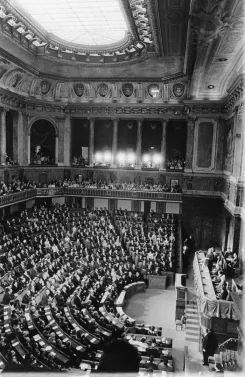 Pour la plupart d’entre nous, Versailles est le palais des rois, le décor qui fut destiné à mettre en scène le pouvoir personnel du Roi-soleil. Toutefois, la présence du pouvoir politique au château ne s’est pas arrêtée avec le départ de la famille royale en octobre 1789, ni avec la fin de la monarchie en 1792. Depuis la Révolution, le pouvoir, qu’il soit impérial, monarchique ou républicain, revient ponctuellement mais régulièrement à Versailles. Capitale de la monarchie absolue pendant un siècle, Versailles fut aussi, pendant près de 9 ans, la capitale de la IIIe République naissante. Entre mars 1871 et juillet 1879, le château fut le cadre de la consolidation du système républicain et du renoncement définitif des Français à la monarchie.