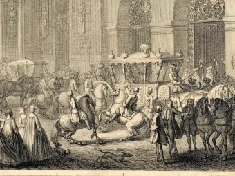 Pas de carrosse sans cheval ! Très tôt domestiqué par l’homme pour ses besoins, le cheval constitue un élément fondamental dans l’éducation du prince. Instrument politique au service du roi, sa représentation est toujours savamment mise en scène.