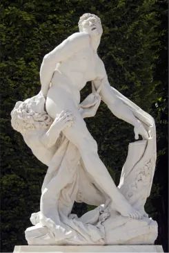 Le célèbre lutteur Milon de Crotone est représenté se défendant contre un lion qui le dévore. Une main coincée dans une écorce d'arbre, le lutteur ne survivra pas à la bête sauvage.