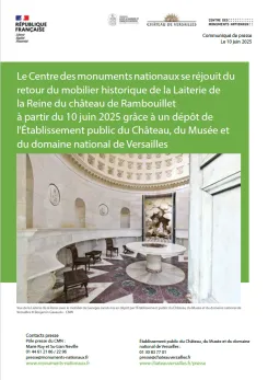 Grâce au dépôt du château de Versailles, les sièges dumobilier étrusque livrés en 1787 par Georges Jacob pour Marie-Antoinette vont regagner le 10 juin 2025 l’écrin pour lequel ils avaient été conçus. Le dépôt de ce mobilier constitue une avancée majeure pour la compréhension de la Laiterie de la Reine par le public.