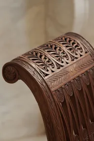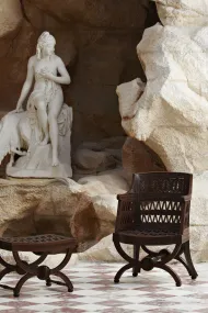 Cet ensemble de 10 chaises, 4 fauteuils, 6 tabourets, 1 grande table et 4 guéridons témoigne du goût étrusque apparu à la toute fin du XVIIIe siècle : dossiers en crosse, pieds postérieurs en sabre, piètement en croix inspirés des sièges curules antiques, croisillons ajourés rappelant des sanglages en cuir. Les frises de palmettes et de myrtes appartiennent également au répertoire antique. La garniture textile est absente, à l’image du mobilier archéologique.