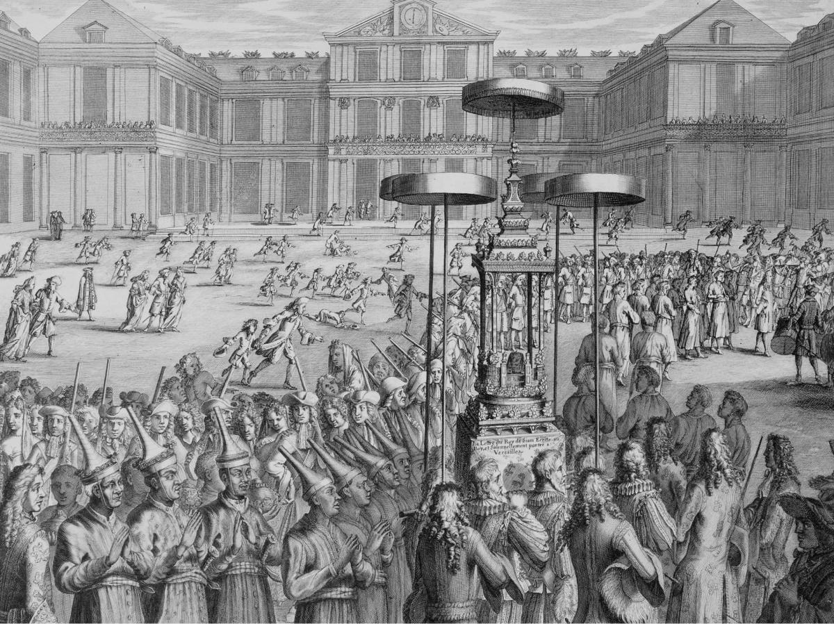 Cette gravure représente la procession des ambassadeurs du Siam arrivant au château de Versailles le 1er septembre 1686. Devant les ambassadeurs se trouve le baldaquin qui contenait la lettre d'or envoyée par le roi du Siam (Thaïlande) à Louis XIV. Le plus âgé des ambassadeurs siamois connaissait bien la cour de l'empereur chinois Kangxi et à ce titre, son roi, Phra Naraï (1633-1688), lui avait confié la tâche de mener une comparaison entre les cours chinoise et française.
