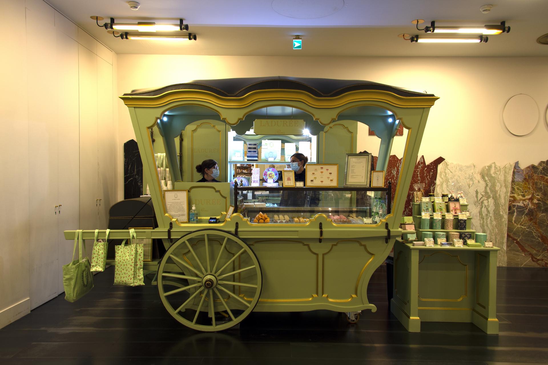 Produits proposés à la vente : macarons, glaces, boissons chaudes et froides, ainsi que des produits Ladurée.
