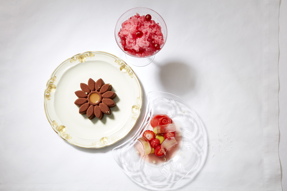 Commencez par une royale de laitue, caviar gold, crème acidulée et sarrasin ou encore des asperges blanches au sautoir, coquillages et herbes amères. Poursuivez par un agneau de lait rôti, des artichauts violets et tagette ou par un tronçon de turbot au naturel, algues pilées et petit pois. En dessert, laissez vous tenter par le 1724 au chocolat et croustillant de pralin, l’élixir de Louis XV, rhubarbe et thé vert ou encore le soufflé de l’Orangerie, granité verveine (plats mentionnés à titre indicatif, sous réserve de modifications en fonction de la saison).