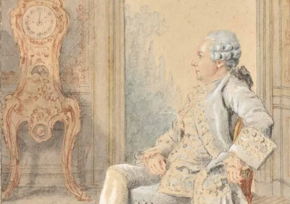 Sur cette belle feuille aquarellée, Carmontelle représente Jean-Benjamin de La Borde (1734 - 1797), nommé en 1762 valet de chambre du roi et gouverneur du Louvre. Il fait face à la célèbre pendule astronomique conçue par Claude-Siméon Passemant dès 1743 et installée dans le petit appartement du roi en 1754. Sur ce dessin, elle est représentée complète, avec son boitier en bronze doré, chef-d’œuvre rocaille de Jacques Caffieri, sur son piédestal de marbre. Carmontelle met ici en scène de manière indirecte l’intimité de La Borde avec le roi, tandis que la clef qu’il tient dans sa main gauche, négligemment mais ostensiblement, évoque sans doute sa fonction de gouverneur du Louvre. Carmontelle et La Borde fréquentaient les mêmes salons parisiens, en particulier celui de la Guimard, célèbre danseuse et commédienne dont La Borde était l’amant et pour laquelle Carmontelle composait des saynètes. Le modèle et l’artiste qui le représente avaient d’ailleurs créé ensemble de petites pièces de théâtre.
