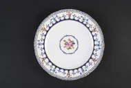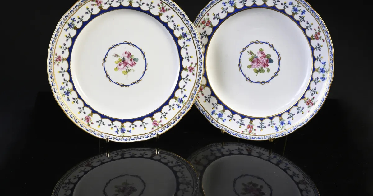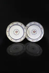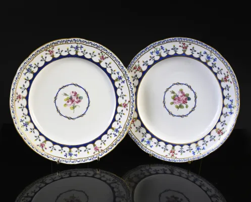 Cette paire d'assiettes en porcelaine tendre comporte une décoration florale de goût champêtre : au centre, un bouquet de roses dans un médaillon cerné d'un filet bleu réhaussé de crosses dorées ; sur l'aile, une bande bleue à festons est piquée de fleurs des champs : barbeaux (terme désignant les bleuets au XVIIIe siècle), myosotis, fleurettes. L'extrémité est soulignée de rinceaux peints en bleu et à l'or entre deux filets dorés.