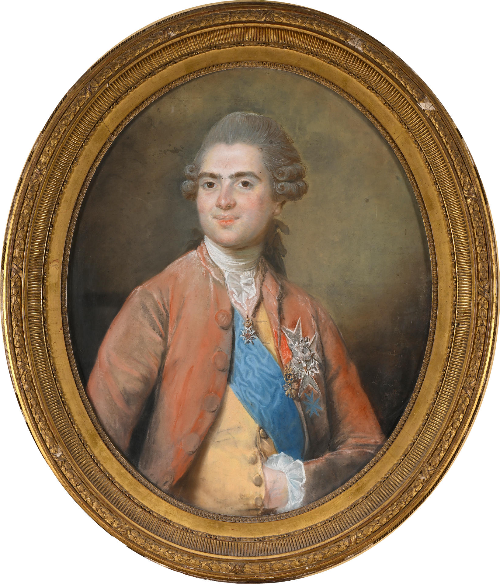 Les couleurs inhabituellement vives, parmi les pastels de Vigée Le Brun, de l’habit d’homme, aux plis soulignés d’un trait noir énergique, ombré de grands aplats bruns, font ressortir le bleu appuyé du cordon et de la croix de l’Ordre du Saint-Esprit. L’arrondi du visage est également marqué, les yeux bruns sont expressifs, la chevelure brune et les sourcils relevés de poudre.
