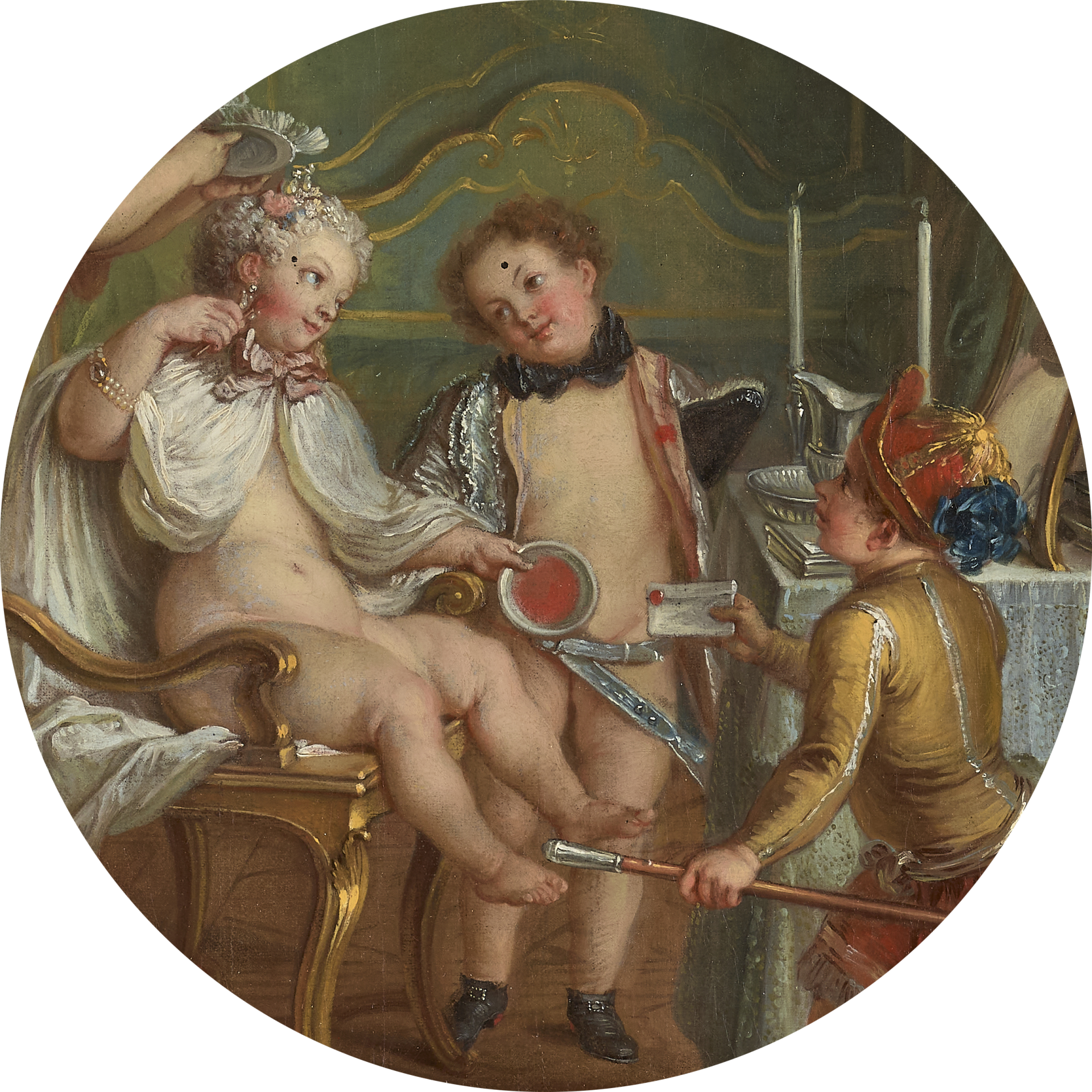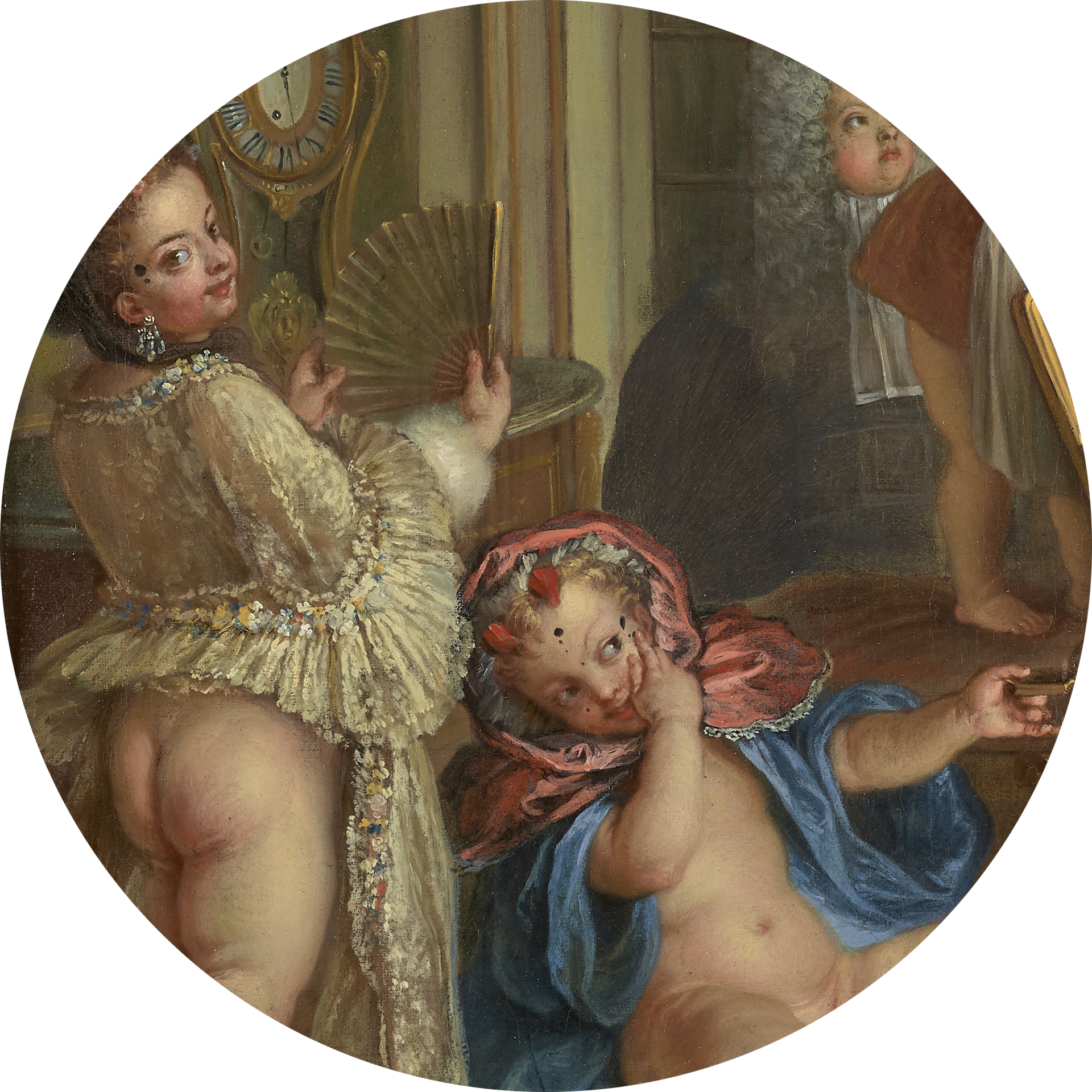 Coypel, qui se moque également de la vanité féminine dans d’autres compositions, reprend ici tous les poncifs des représentations de femmes à leur toilette, tant dans le décor que dans le choix des accessoires — miroir, palette à fard, mouches, etc. Les trois personnages masculins disposés autour du groupe central — un homme de loi, un gentilhomme et un abbé de cour — confèrent à la scène une dimension sociale et galante, empreinte de séduction. Le personnage de l’émissaire portant une lettre suggère d’ailleurs la présence d’un admirateur absent, destinataire implicite de l’attention que la figure principale consacre à son apparence.
