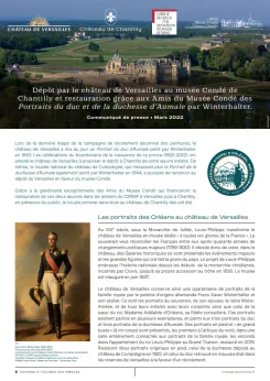 Depuis plus d’un siècle, Versailles a consenti le dépôt de 2 566 œuvres de ses collections, dont 1 275 peintures. Aujourd’hui le musée Condé ne conserve aucun exemplaire de ces effigies célèbres du duc d’Aumale et de son épouse jeunes. Or le château de Versailles dispose de plusieurs versions dans ses collections, parmi lesquelles ces œuvres de Winterhalter non exposées, trouveront par ce dépôt la plus belle des destinations, le château de Chantilly, propriété du duc d’Aumale depuis 1830.