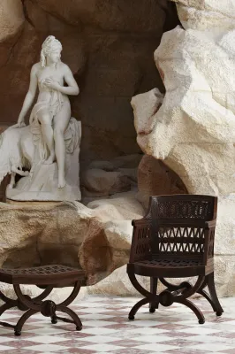 La présence de têtes de béliers sur les pieds des fauteuils et des tabourets rappelle également la fonction du lieu, un temple dédié à la délectation des produits laitiers. Ce mobilier, unique par son luxe et son raffinement, appartient à un décor complet, résonnant avec les sculptures pastorales de Pierre Julien et le service en porcelaine de Sèvres commandé à Jean-Jacques Lagrenée.