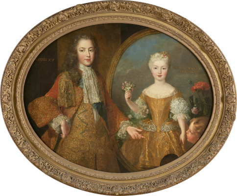 Cette toile des collections du château de Versailles fut peinte en 1724 par Alexis-Simon Belle, peu avant le retour de l'infante en Espagne. Alexis-Simon Belle reprend la formule du double portrait princier popularisée par François de Troy. D’abord conçu de façon rectangulaire, le peintre opte finalement pour une forme ovale pour se concentrer sur les visages du jeune roi et de sa fiancée.
