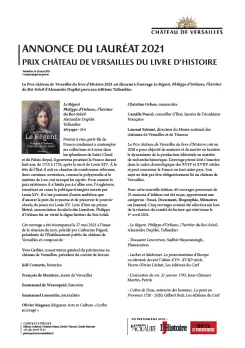 Le Prix château de Versailles du livre d’Histoire créé en 2018 a pour objectif de soutenir et de mettre en lumière le dynamisme de la production éditoriale en matière de recherche historique. L’ouvrage primé doit s’inscrire dans le cadre chronologique des XVIIe et XVIIIe siècles et peut concerner la France ou tout autre pays. Son sujet ne doit pas être obligatoirement lié au château de Versailles.