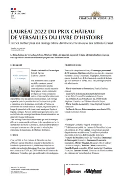 Créé en 2018, le Prix château de Versailles du livre d’Histoire a pour objectif de soutenir et de mettre en lumière le dynamisme de la production éditoriale en matière de recherche historique. L’ouvrage primé doit être consacré au XVIIe, au XVIIIe siècle, ou à l’histoire du château de Versailles, quel que soit le cadre chronologique.