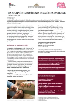 « Les métiers d'art à Versailles ». Depuis des générations, sculpteurs, peintres, marbriers, ébénistes, ou encore tapissiers assurent la pérennité de leur savoir-faire. Les visiteurs pourront observer des pièces d'exception, s'interroger sur les techniques et les gestes dont certains sont toujours pratiqués aujourd'hui, et saisir le talent inventif de ces véritables créateurs.