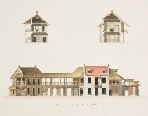 Ces sept dessins de grandes dimensions récemment acquis témoignent des restaurations prévues pour les maisons du Hameau, la ferme et l'Orangerie du Petit Trianon à l'époque du Premier Empire.