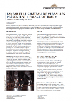 Pour composer Palace of time, Fakear s'est immergé dans l'univers sonore du château de Versailles. En explorant le lieu, il découvre les sons envoûtants de ses horloges et enregistre leurs cliquetis et leurs mécanismes : J'ai repiqué de nombreuses horloges du château de Versailles, gardiennes éternelles du lieu et symbole de ce temps étrange, parfois élastique de notre époque, explique l'artiste. De manière furtive, les bruits de pas sur le sol et les sons produits par les portes du Château rythment Palace of time. Ils cohabitent avec les sons réguliers produits par les horloges, détentrices d’un temps immuable et confèrent au titre une atmosphère propice à la méditation autant qu’à l’énergie du mouvement.