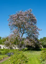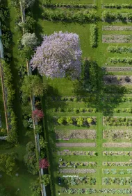 en plusieurs parterres, surplombées par le grand Paulownia, cet arbre impérial qui se pare de fleurs au printemps. Une serre enterrée permet notamment de faire pousser des aromates et certains végétaux toute l’année grâce à sa température constante. Les allées du jardin contiennent des agrumes en pot, des orangers et citronniers, dont les fruits seront visibles à l’été.