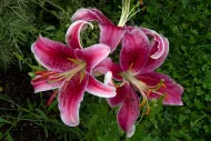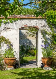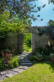 3. Enfin, il faut traverser le verger composé de plusieurs dizaines d’arbres fruitiers pour découvrir « Le Jardin secret » à l’atmosphère plus intime. Entouré de murs de pierre, on y entre grâce à une porte. Un jardin semi-ombragé est aménagé de pas japonais en pierre naturelle. Le visiteur s’y promène comme s’il traversait une rivière, et découvre des vivaces et des plantes singulières qui fleurissent à différents moments de l’année. Couvert par un immense Laurier du Caucase, orchidées, rosiers et lis géants de l’Himalaya se côtoient, se naturalisent et s’habituent à leur environnement. Un banc invite les visiteurs à s’asseoir, pour admirer une belle perspective sur ce jardin méditatif.