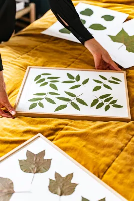 Accompagnés par les jardiniers du domaine, les équipes d'Herbarium ont minitieusement sélectionné les plus belles feuilles. Elles ont été immortalisées, encore fraîches, grâce à un pressage naturel de plusieurs semaines. Les compositions ont ensuite été montées une à une, à la main, dans les ateliers parisiens d'Herbarium puis soigneusement contrôlées afin d’assurer la finesse de chaque détail, faisant de chacun de ces herbiers des pièces uniques.