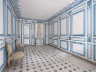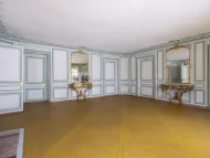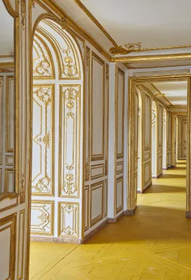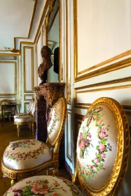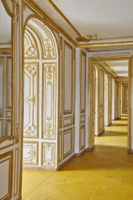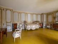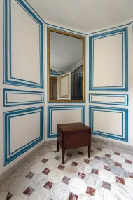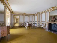 L’appartement de madame Du Barry est situé au second étage du château, à proximité immédiate des appartements privés du Roi. Louis XV décide en 1770 de loger sa favorite à cet emplacement prestigieux et convoité, auquel il accède par plusieurs escaliers privés. À la demande de madame Du Barry, les pièces principales sont pourvues d’un décor blanc et or, privilège princier. L’autre moitié de l’appartement présente d’exceptionnels décors polychromes, témoignages rares et précieux du goût du XVIIIe siècle, dont très peu nous sont parvenus jusqu’à aujourd’hui. Loin des espaces de représentation de la Cour, la favorite déploie un très grand raffinement dans ce lieu qu’elle fait agrémenter de mobilier et d’objets d’art à la pointe de la mode.