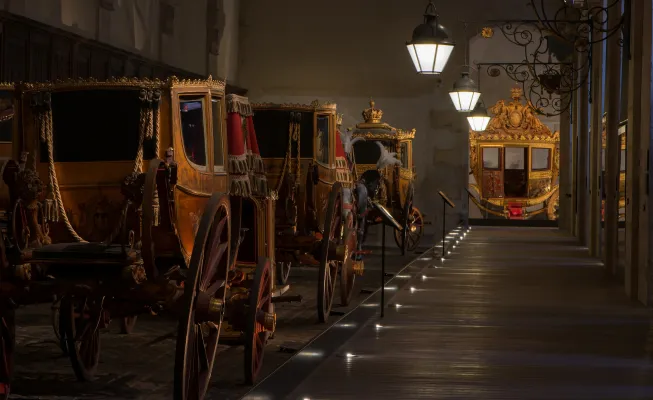 Conçus pour frapper les esprits,les carrosses de Versailles sont des chefs-d’œuvre d’art total. D’un luxe ostentatoire, ornés à profusion d’ors et de sculptures, ils ont été réalisés par les meilleurs artistes de la Cour : architectes, menuisiers, sculpteurs, ébénistes, bronziers, ciseleurs, doreurs, tapissiers, brodeurs, passementiers etc. Les visiteurs découvriront au plus près ces voitures de grand apparat, comme les berlines du mariage de Napoléon Ier, le carrosse du sacre de Charles X, le char funèbre de Louis XVIII, mais aussi des harnais richement garnis de bronze doré, des chaises à porteur, les petits carrosses des enfants de Marie-Antoinette et une étonnante collection de traineaux de fantaisie réalisés sous le règne de Louis XV.