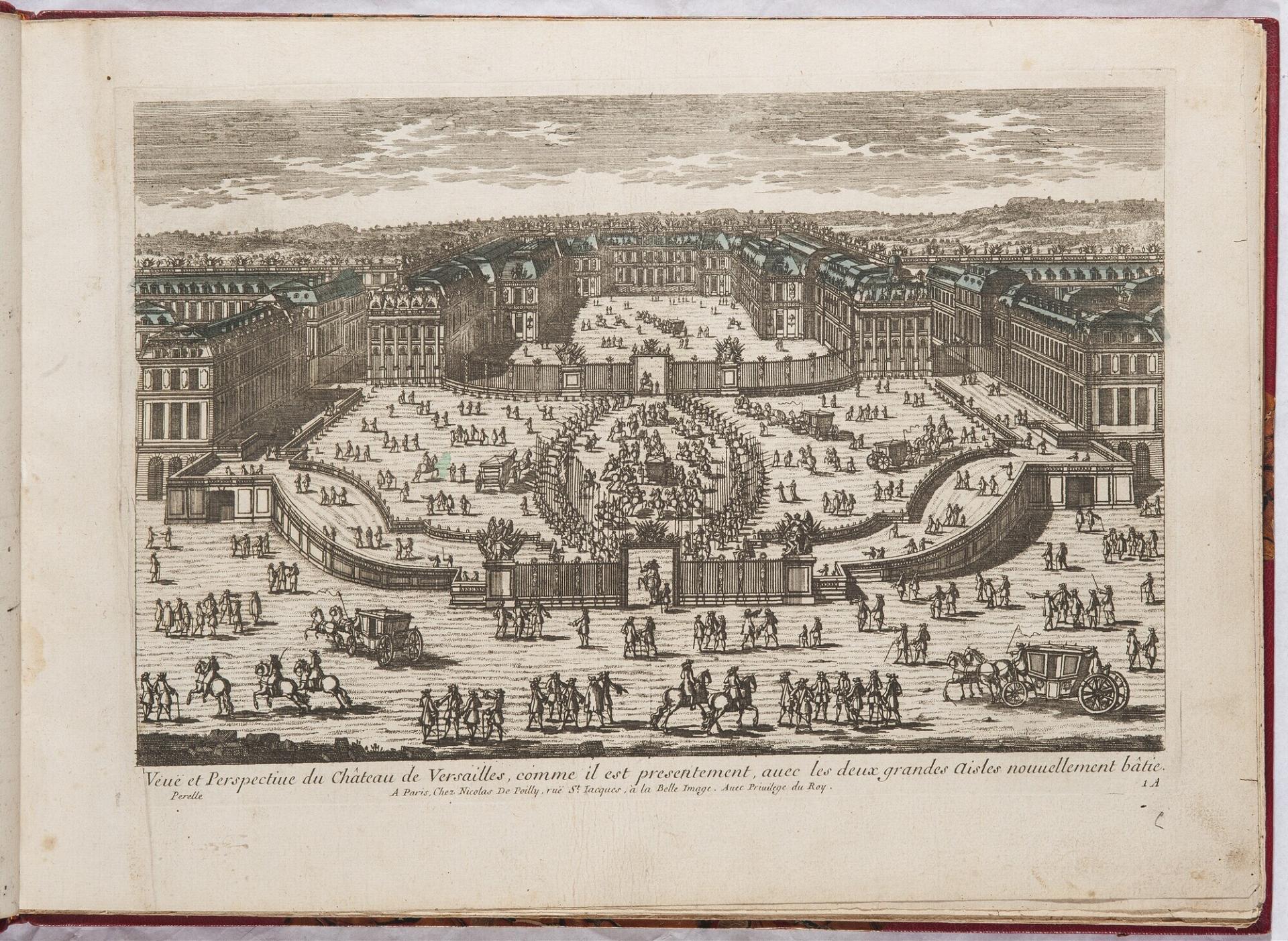 Famille Perelle (graveur), Vue et Perspective du Château de Versailles, comme il est présentement, avec les deux aisles nouvellement bâtie, eau-forte aquarellée, 1689-1695, GR. 138.2, Collections du Château de Versailles