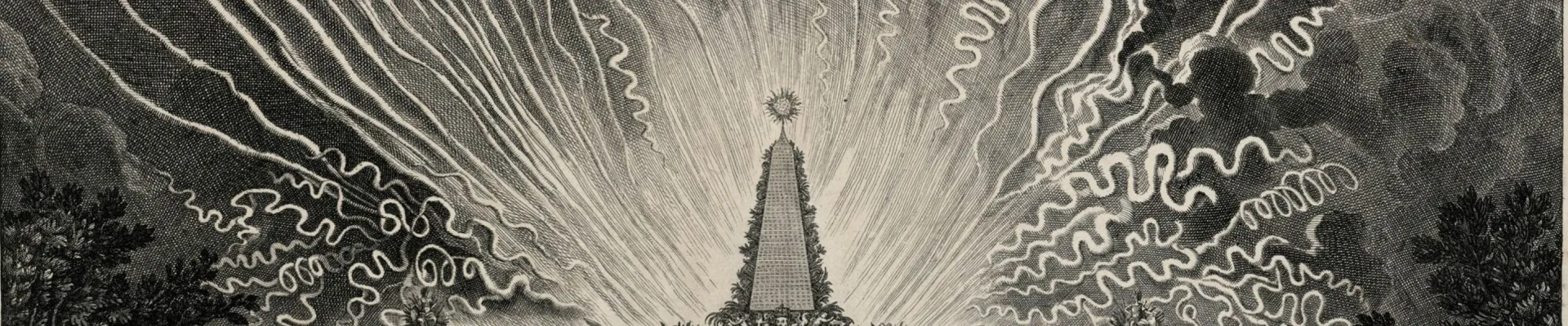 Après la conquête de la Franche-Comté, Louis XIV fait donner une série de fêtes à Versailles durant l’été 1674. Parmi les divertissements, le feu d’artifice tiré au-dessus du Grand Canal est une attraction majeure. Il permet d’inaugurer le canal récemment terminé et de montrer la richesse et la puissance du roi. Félibien décrit ce spectacle grandiose en montrant le sens caché à accorder à ce tableau : il insiste avant tout sur les effets de lumière qui symbolisent la gloire du Roi-Soleil tout-puissant en son royaume.