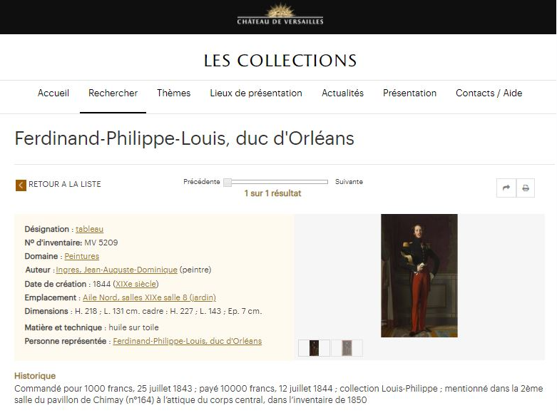 Fils aîné de Louis-Philippe, Ferdinand-Philippe-Louis est représenté dans un portrait d'apparat réalisé par son ami, Jean-Auguste-Dominique Ingres. Ce dernier, grand représentant de la peinture néo-classique, expose le Duc d'Orléans dans un costume militaire avec une attitude dominante dans le Palais des Tuileries.