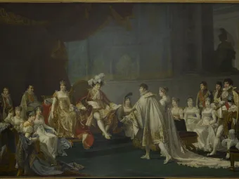 Élève de Jacques-Louis David, peintre de cour sous Napoléon Ier et plus tard peintre des rois Louis XVIII et Charles X, François Gérard est le portraitiste des familles souveraines d’Europe. En 1805, il réalise le portrait de l’empereur Napoléon en habit de de sacre dont le manteau pourpre brodé d’abeilles en or. Le commentaire de l’œuvre permet de revenir en détail sur les nouveaux symboles du pouvoir choisis par l’Empereur.